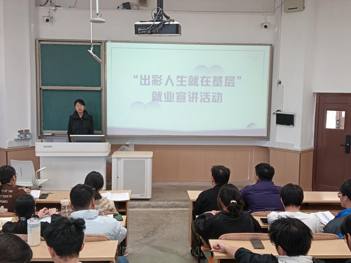 在04324教室举办“出彩人生就在基层”就业主题宣讲活动。学院各年级学生代表共80余人参会。