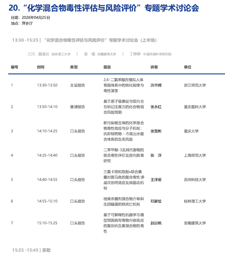 2026年4月24日至26日,第十一届全国生态毒理学大会在江西南昌举行。本届大会以“生态毒理学与绿色发展”为主题,设置了10个大会特邀报告、33个专题学术讨论会和3个研究生论坛,共进行544场口头报告。